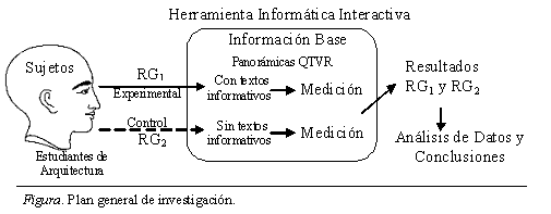 Capítulo 3: Metodología y Procedimientos Tipo de Investigación e Hipótesis El estudio se inscribe en un diseño cuasiexperimental, formado por el grupo de estudiantes de recién ingreso a la carrera de arquitectura, en donde se tiene una variable independiente, para analizar las consecuencias que originan su manipulación, en una variable dependiente bajo una situación de control. El ambiente virtual o Herramienta Informática Interactiva contiene la información base y representa la situación de aprendizaje a la que son expuestos grupos de participantes constituidos por estudiantes de nuevo ingreso a la carrera de arquitectura. La información base está constituida de panorámicas QTVR de edificaciones existentes, diferenciándose en, (a) edificaciones con acceso real, es decir que el sujeto tiene oportunidad de recorrer y apreciar en la realidad y (b) edificaciones que por estar situadas fuera del contexto de los participantes, no pueden ser visitadas. Las panorámicas QTVR de edificaciones con acceso real se presentan al sujeto como espacio para la comprensión de la herramienta, es decir como ayuda dirigida que permite la familiarización con la Herramienta Informática Interactiva. Por ello la variable independiente está representada por la exposición a una Herramienta Informática Interactiva que contiene panorámicas QTVR interactivas con información explícita o no, de edificaciones reales, situadas fuera del contexto del participante. Luego tomando en cuenta el estudio de VanEsselstyn (2001), se establecen panorámicas QTVR interactivas con textos indicativos o contenidos informativos y con ausencia de ellos, para estudiar la influencia de los mismos según lo establecido por diversos estudios (Broadbent, 1974; Bandura, 1982; Gardner, 1999; Linde & Labov, 1975; Sjölinder, 2000; Taylor & Tversky, 1996). La variable dependiente es la comprensión, adquisición o aprendizaje de los elementos básicos de la arquitectura, en estudiantes de nuevo ingreso a la carrera de arquitectura, determinada por el aumento o disminución de su capacidad espacial, con lo cual se pueden establecer respuestas a las preguntas iniciales de investigación: 1. ¿Cómo se puede utilizar la tecnología de la realidad virtual no-inmersiva para mejorar el aprendizaje de los elementos básicos de la arquitectura? Para mejorar el aprendizaje, en cantidad y calidad, es preciso incidir en la motivación de los estudiantes tal como lo ha mencionado Nuñez (1998), modificando sus metas personales hacia metas de aprendizaje utilizando medios interactivos autónomos para la manipulación y visualización de ambientes virtuales. Búsqueda de estrategias para la solución de problemas reales que se encuentran en espacios traídos de la realidad. Dar a conocer y evaluar sus destrezas y habilidades (capacidad espacial) para prepararlos para sus logros futuros. Propiciar un ambiente de aprendizaje que resalta la autonomía y metas cooperativas para aprender a aprender. Todo ello delimita una Herramienta Informática Interactiva que permite apreciar o considerar la capacidad espacial de los estudiantes como instrumento de aprendizaje vivencial de la arquitectura. 2. ¿Cómo verificar la capacidad espacial en los estudiantes de arquitectura de recién ingreso, utilizando la realidad virtual no-inmersiva? Tal como ha sido descrito la capacidad o habilidad espacial puede ser reconocida y revelada mediante test o pruebas independientes que pueden estar contenidas en la Herramienta Informática Interactiva, utilizando la realidad virtual no-inmersiva. De allí que se formula la siguiente hipótesis: La exposición a panorámicas interactivas QTVR, que contienen información base de edificaciones reales sin posibilidades de su observación o vivencia real, permite el aumento significativo del aprendizaje de los elementos básicos de la arquitectura en estudiantes de recién ingreso a la carrera de arquitectura, denotado en el aumento de valores de capacidad espacial. Por el contrario se establece una hipótesis nula: La exposición a panorámicas interactivas QTVR, que contienen información base de edificaciones reales sin posibilidades de su observación o vivencia real, no permite el aumento significativo del aprendizaje de los elementos básicos de la arquitectura en estudiantes de recién ingreso a la carrera de arquitectura, denotado en la observación de variaciones no significativas en los valores de capacidad espacial. El plan general de investigación se basa en la asignación, de forma aleatoria y equivalente, de grupos experimental y control de estudiantes de recién ingreso a la carrera de arquitectura. El grupo experimental utiliza la Herramienta Informática Interactiva, variable independiente, con estímulos definidos por panorámicas (recorridos) QTVR interactivas con textos informativos o contenidos de aprendizaje. El grupo control visualiza panorámicas (recorridos) QTVR interactivas sin textos informativos, incluidas en la Herramienta Informática Interactiva, para comprobar por mediciones o evaluaciones, la incidencia de la variable independiente. Ver Figura.